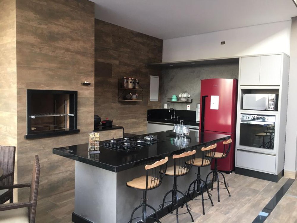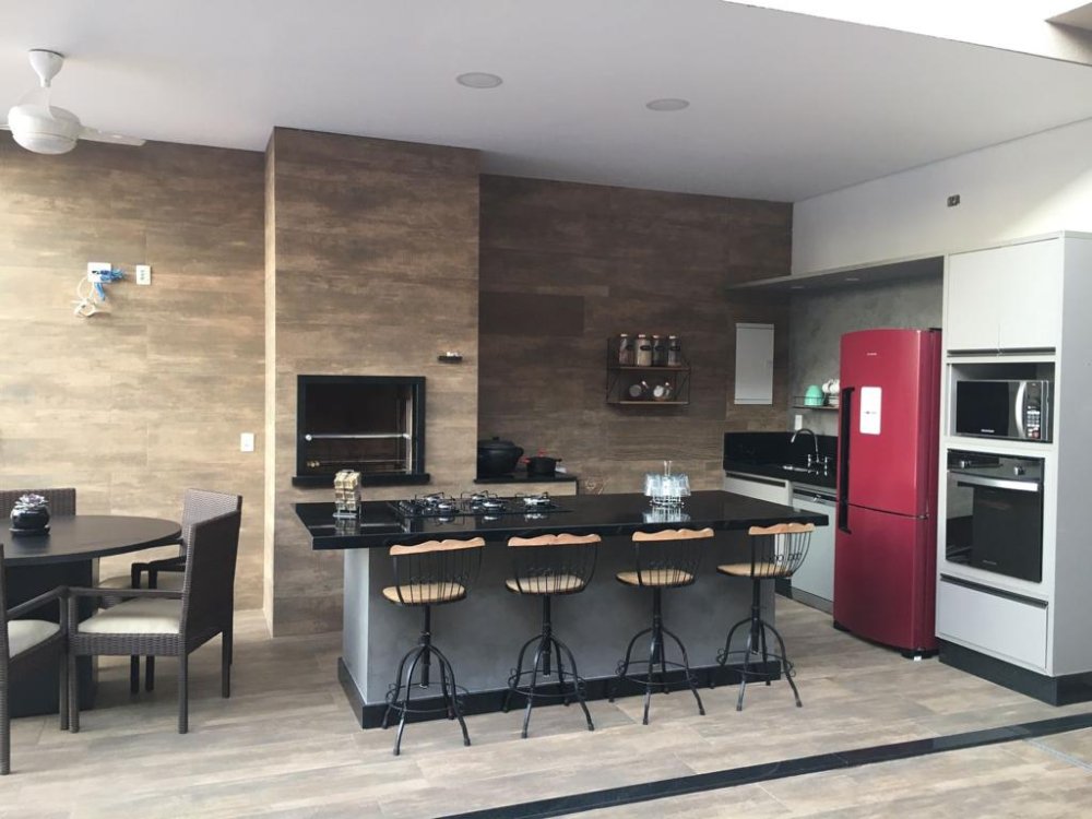 * linda área gourmet com churrasqueira integrada com a piscina